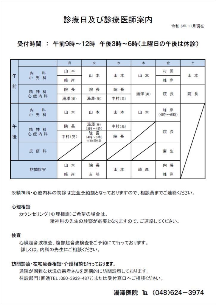 | 火 | 院長 湯澤美菜(一般外来・もの忘れ外来) | ~16:00湯澤美菜 16:00~院長 |