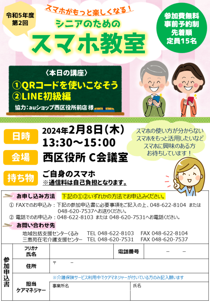 地域包括支援センターと在宅介護支援センターの共同開催で「シニアのためのスマホ教室」を開催します。