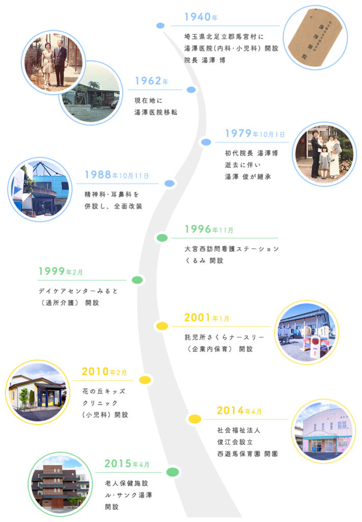 これまでの博滇会グループ 各事業(医療、介護、託児・保育事業)の歩みと共にご紹介いたします。 ご挨拶 無医村だった馬宮村に初めての診療所として1940年に誕生した湯澤医院は、博滇会グループとして地域の皆さまに見守られながら少しずつその規模を拡充して参りました。博滇会グループは先代の理念を継承し、子供から高齢者まで地域の健康を守ることを目標に掲げ、現在診療所2カ所、通所サービス(リハビリ・認知症<重度認知症ケア含>・社会参加型)7カ所、居宅介護支援事業所4カ所、有料老人ホーム3カ所、介護老人保健施設、地域包括支援センター、訪問看護、訪問介護、訪問リハビリ、認知症初期集中支援チーム、認可保育園、企業内保育を運営しております。またこれらの施設機能を支えるため、2020年4月末日現在、総勢常勤214名、非常勤230名が業務に従事しております。これからも博滇会グループは、医療・介護・保育の分野で、地域に根差し、人と人との繋がりを大切にして社会貢献に努めてまいります。今後とも博滇会グループをよろしくお願いいたします。 2020年5月吉日